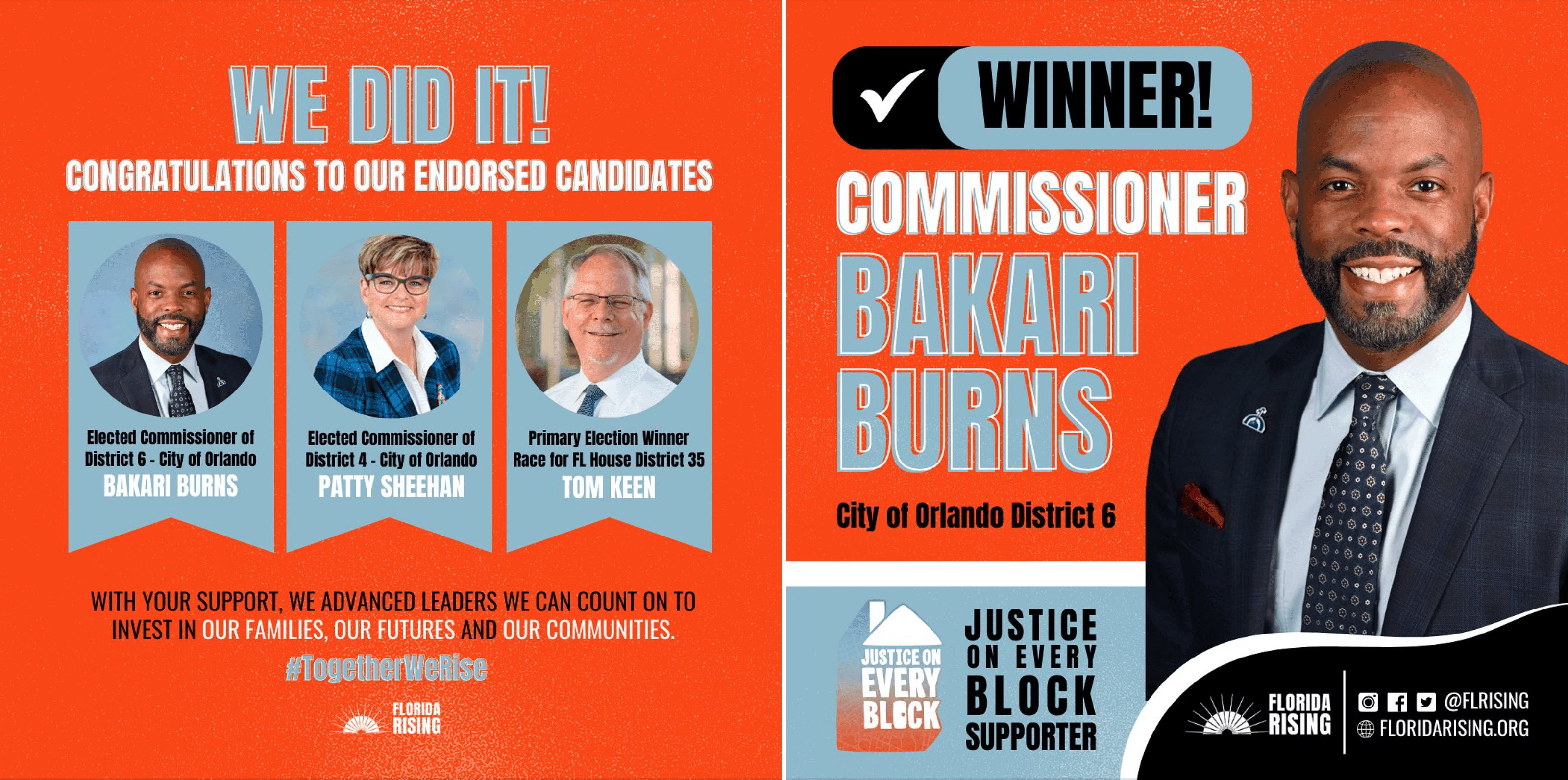Florida Rising celebrating the election of Orlando City Council Commissioners Bakari Burns & Patty Sheehan, and Tom Keen for FL House District 35.