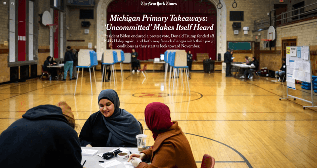On Tuesday, more than 100,000 Michiganders voted "uncommitted" instead of for Joe Biden, in protest against Biden's approach to the war in Gaza and a call for a ceasefire. In densely Arab-American communities of Dearborn and Hamtramck over 50% voted uncommitted, along with 15-20% in college towns like Ann Arbor and East Lansing.